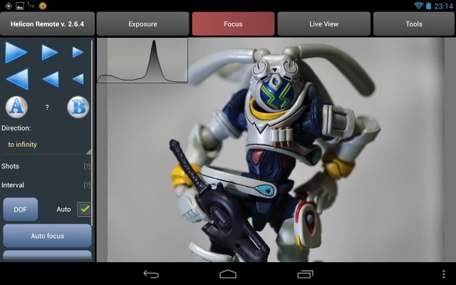 レンズをAF状態にしておくと、右側にある青い矢印ボタンでNexus7側からピントを調整できます。