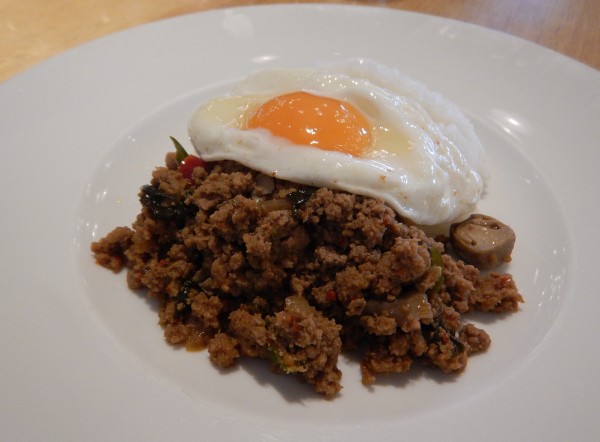 タイ風鶏そぼろご飯に目玉焼きが載っています。