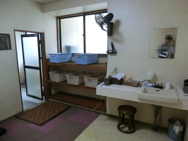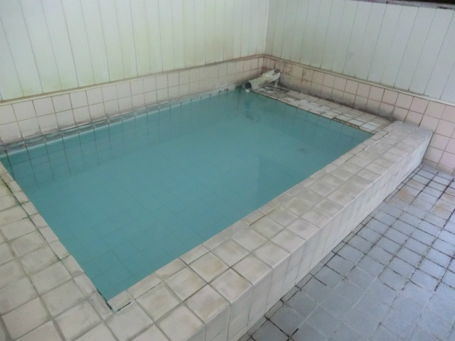 こちらも源泉かけ流しで、右奥の湯口から注がれたお湯は浴槽内の塩ビ管に流れていく仕組みになっていました。