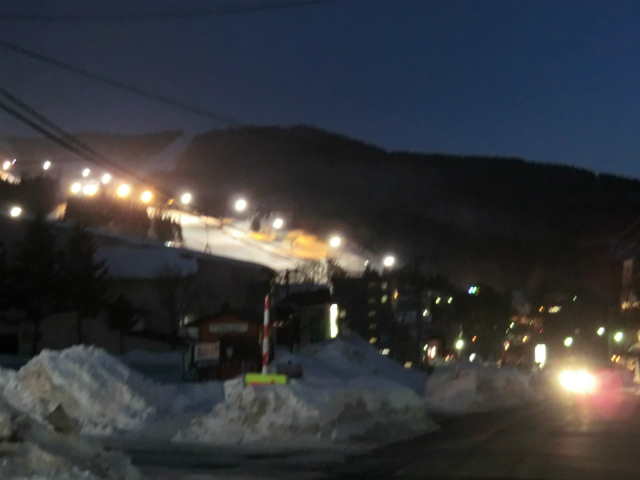 ホッカホカになった帰り道、ゲレンデはナイターで賑わっている様子。