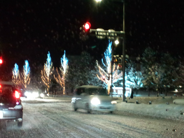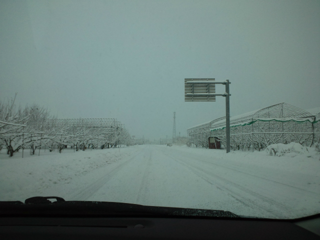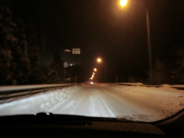 断続的に降る雪のおかげで視界も悪いし道路も真っ白ですよ。