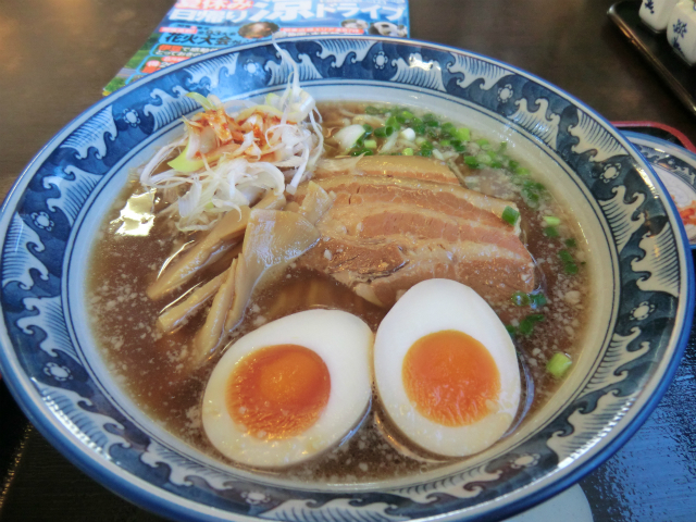透き通った醤油ベースのスープの中に中太のちぢれ麺。