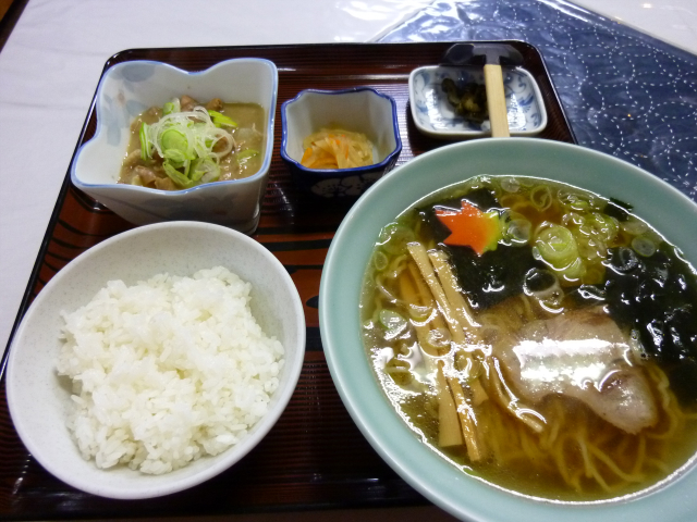 醤油ラーメンにモツ煮込み、それと半ライスのセットです。