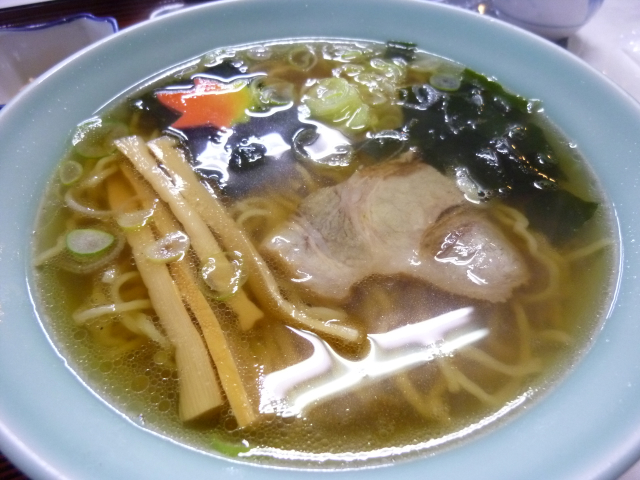 アッサリとした醤油スープと細目縮れ麺の組み合わせ。