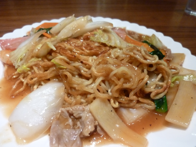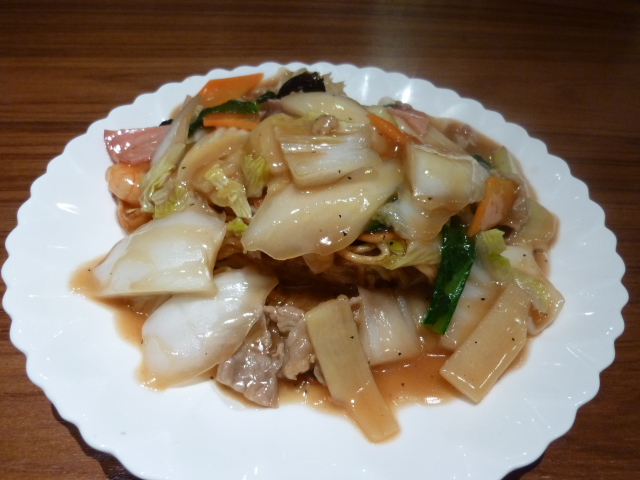 麺の上には甘じょっぱいアンで炒められた具材が山盛りになっています。