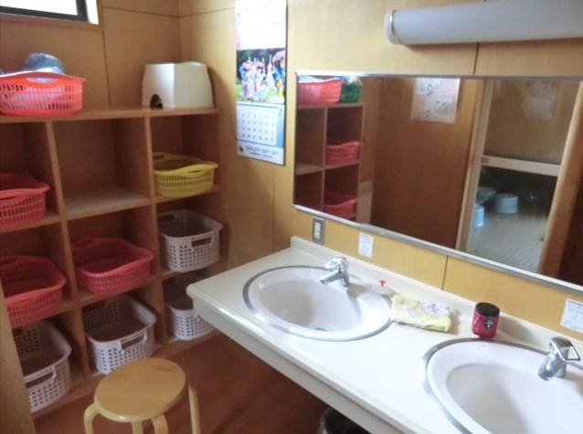脱衣所はかごの数のわりにだいぶ狭く、2人もいれば窮屈になりそう。