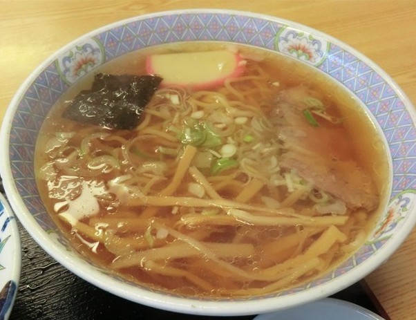 色の薄い透明な醤油スープに、プリプリした中太ちぢれ麺の組み合わせ。