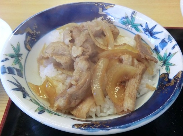 柔らかめのご飯の上に、甘じょっぱく味付けられた豚肉&玉ネギが載っています。