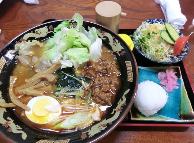 ラーメンだけかと思っていたらサラダにおにぎりまでセットでした。