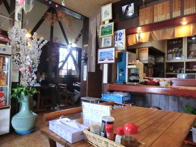 店内は右手にテーブル席とカウンター席、左手に小あがり席があります。