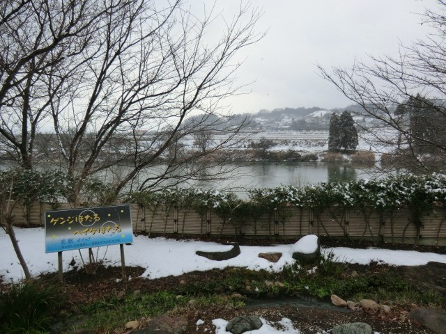最上川も近くを流れていますが、柵があるため立ち上がらないと見れません。