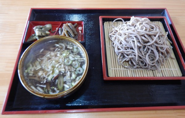冷たいもりそばに、温かいきじ肉入りのつゆの組み合わせ。