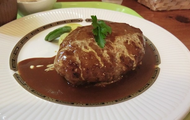 デミグラスソースの掛けられたハンバーグはふっくらとした焼き上がり。