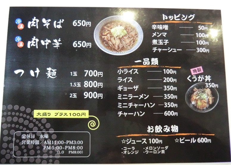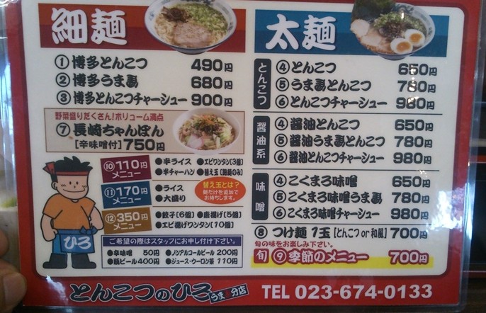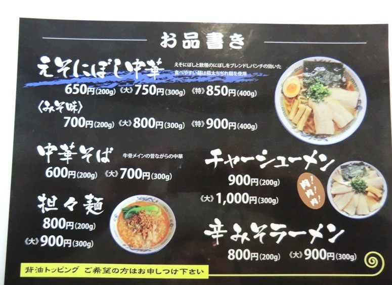 醤油味に味噌味がメインで、他に坦々麺とつけ麺があるようです。